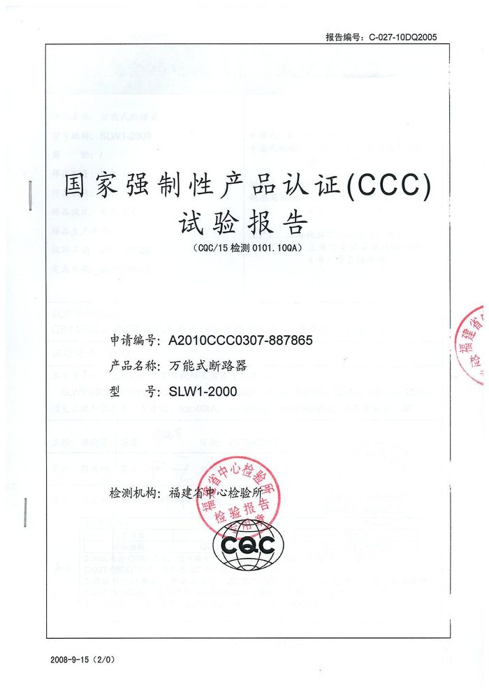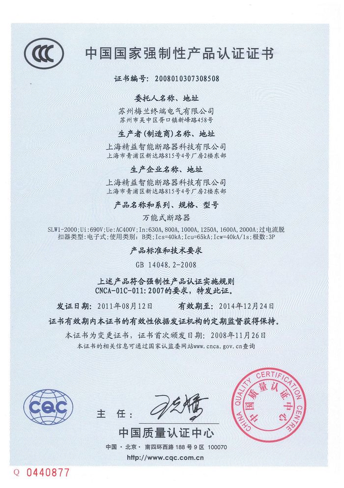 SLW1-2000萬(wàn)能斷路器資質(zhì)證書(shū)
