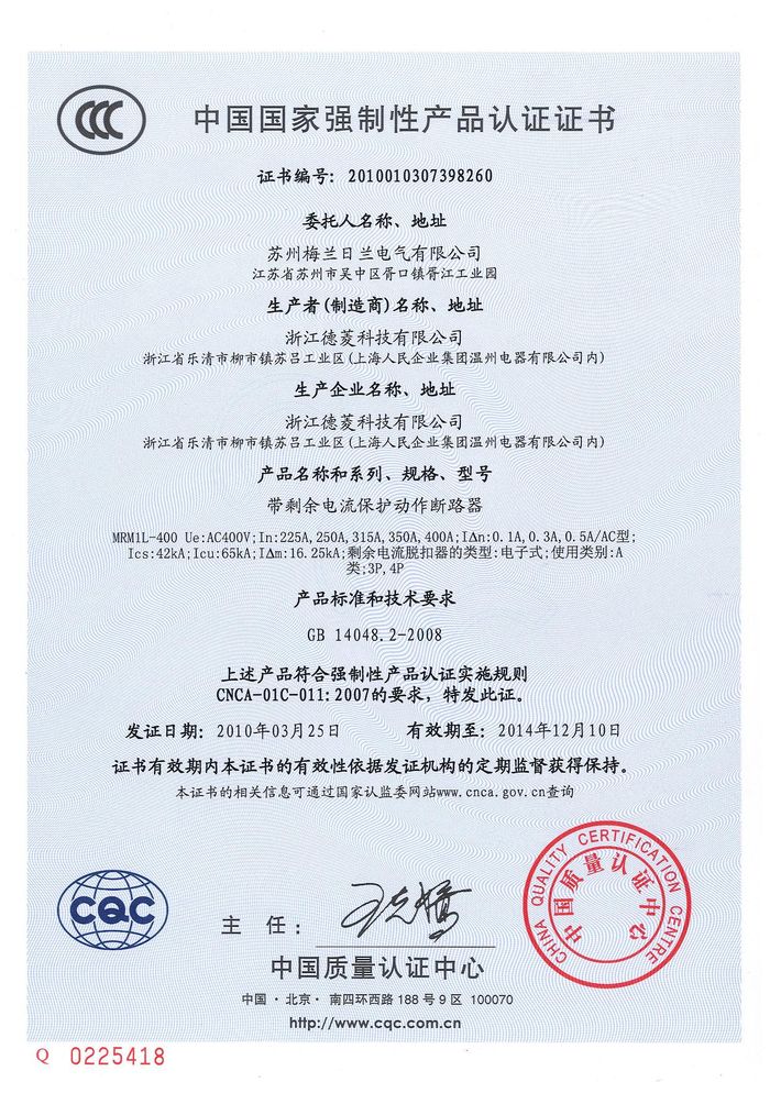 MRM1L-400塑殼漏電資質證書