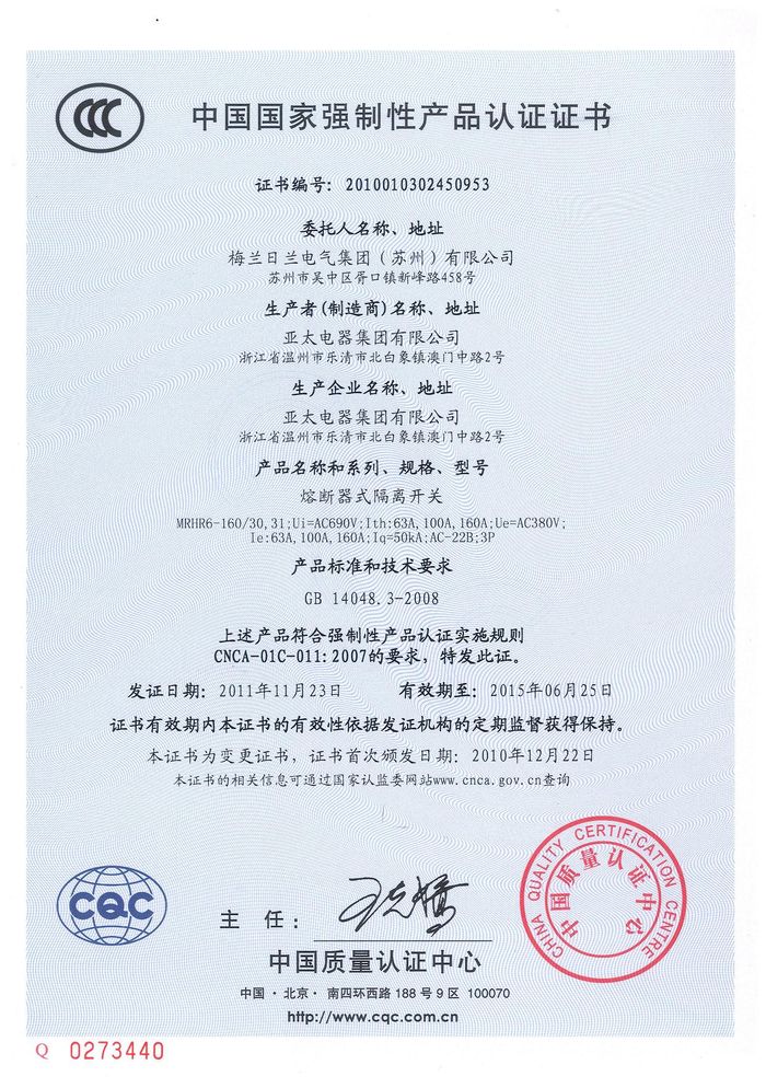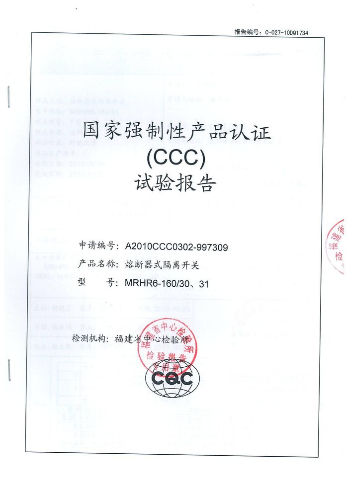 MRHR6-160熔斷隔離開(kāi)關(guān)資質(zhì)證書