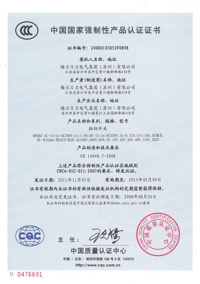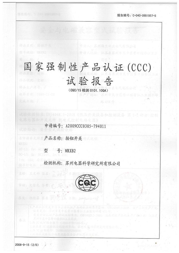 MRXB2按鈕開關(guān)資質(zhì)證書