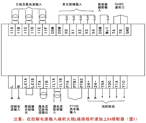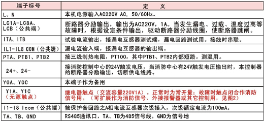 | ILIA. ILIB | 漏電輸入端,接零序互感器的輸出端。 RS485通訊口,TA、TB為485信號線,GND為信號地 |