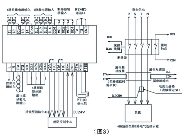 3、分體式剩余電流監(jiān)控探險測器端子圖和外接線路圖