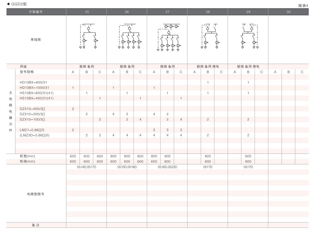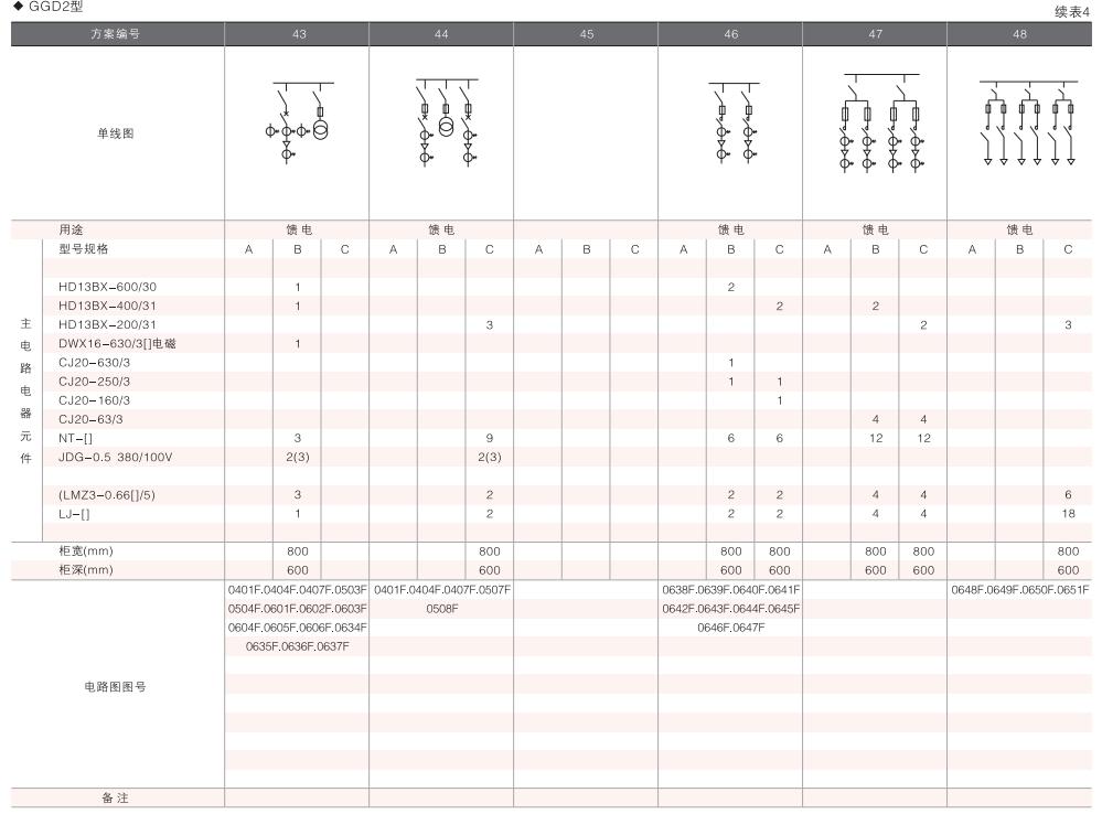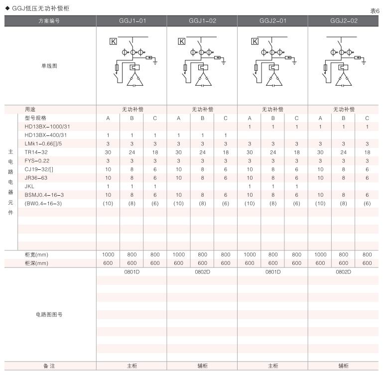 此外,為適應(yīng)無功補(bǔ)償?shù)男枰O(shè)計了GGD電容補(bǔ)償柜,其主電路方案4個,共12個規(guī)格。